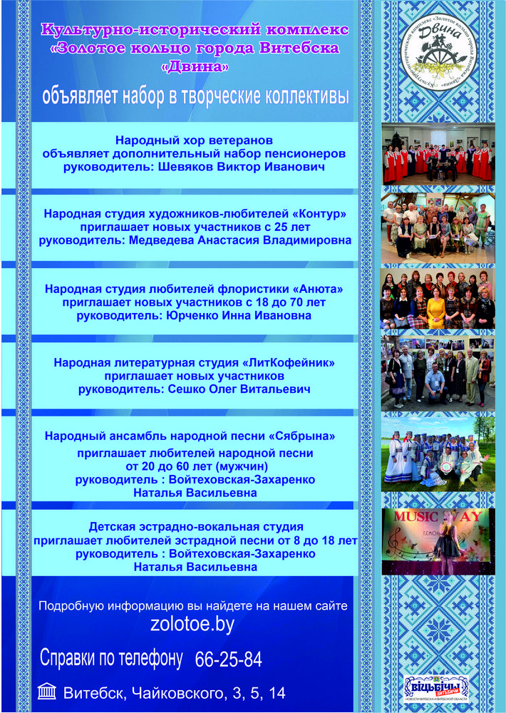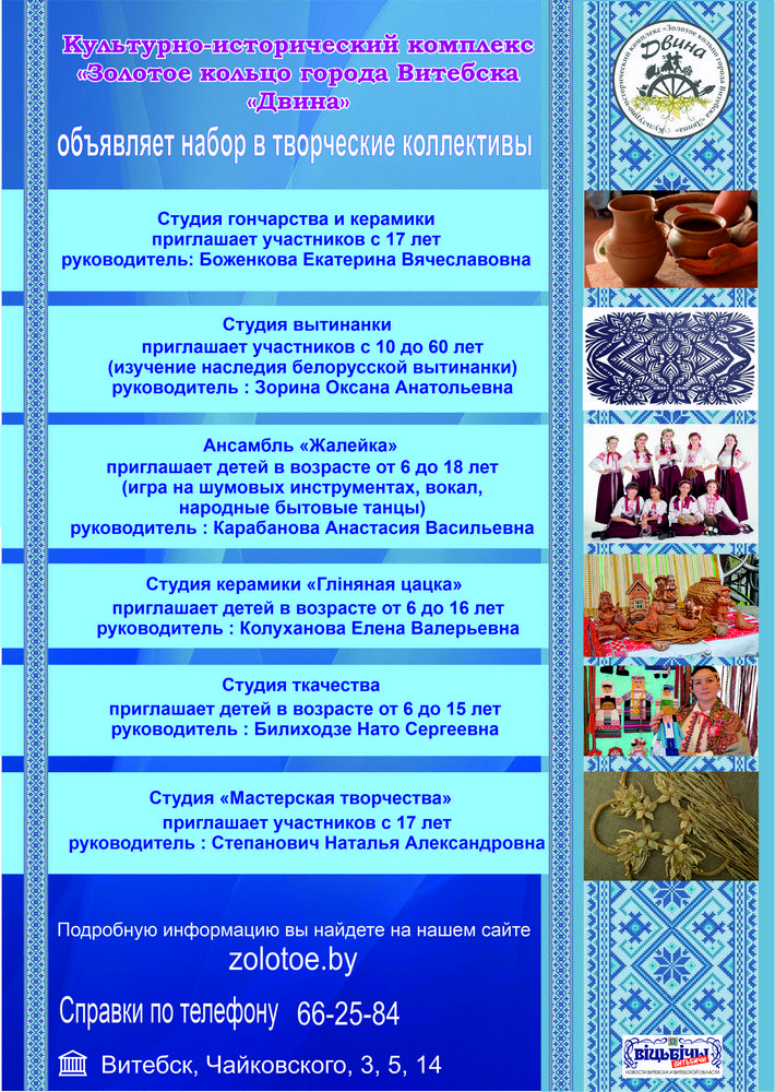 Государственное учреждение «Культурно-исторический комплекс «Золотое кольцо города Витебска «Двина» является учреждением культуры клубного типа и исполняет культурно-образовательные, научно-исследовательские, консультационно-методические функции, деятельность которых направлена на сохранение, развитие и пропаганду лучших народных традиций.